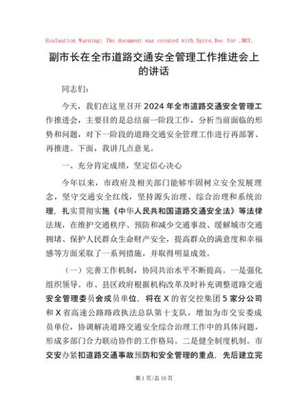 / 副市长在全市道路交通安全管理工作推进会上的讲话