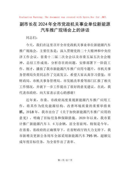 / 副市长在2024年全市党政机关事业单位新能源汽车推广现场会上的讲话
