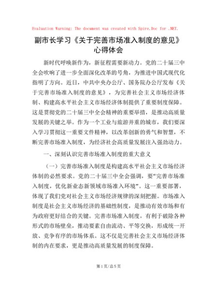 副市长学习《关于完善市场准入制度的意见》心得体会