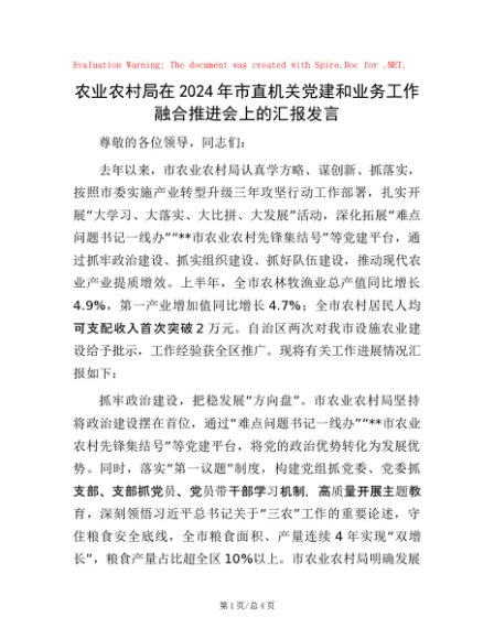 / 农业农村局在2024年市直机关党建和业务工作融合推进会上的汇报发言