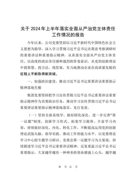 / 关于2024年上半年落实全面从严治党主体责任工作情况的报告