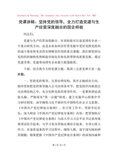 / 党课讲稿:坚持党的领导,全力打造党建与生产经营深度融合的国企样板