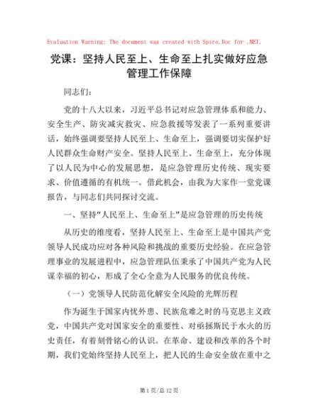 党课:坚持人民至上、生命至上 扎实做好应急管理工作保障