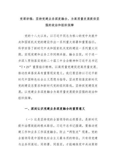 / 党课讲稿:坚持党建业务深度融合,为高质量发展提供坚强的政治和组织保障