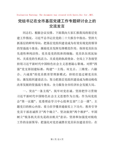 / 党组书记在全市基层党建工作专题研讨会上的交流发言