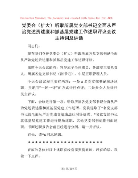 / 党委会(扩大)听取所属党支部书记全面从严治党述责述廉和抓基层党建工作述职评议会议主持词及讲话