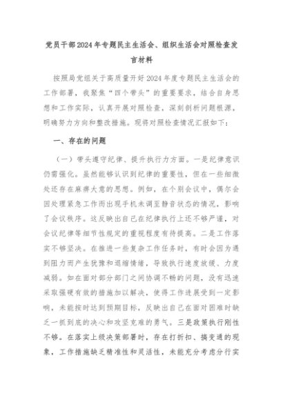 / 党员干部2024年专题民主生活会、组织生活会对照检查发言材料