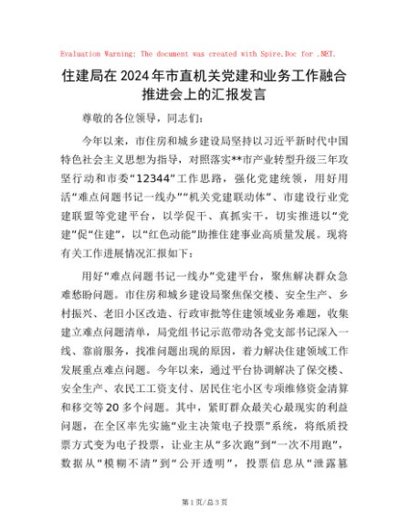 / 住建局在2024年市直机关党建和业务工作融合推进会上的汇报发言