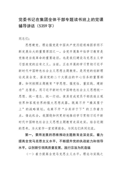 / 党委书记在集团全体干部专题读书班上的党课辅导讲话(5359字)