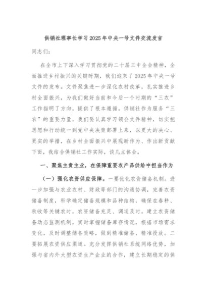 / 供销社理事长学习2025年中央一号文件交流发言