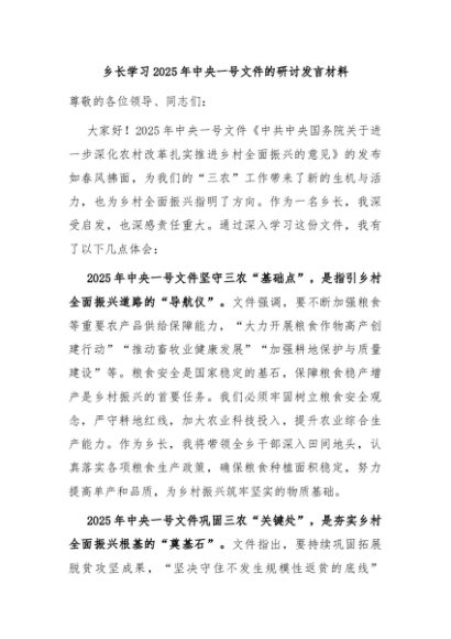 / 乡长学习2025年中央一号文件的研讨发言材料