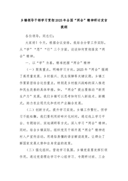 / 乡镇领导干部学习贯彻2025年全国“两会”精神研讨发言提纲