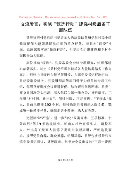 交流发言:实施“甄选行动” 建强村级后备干部队伍