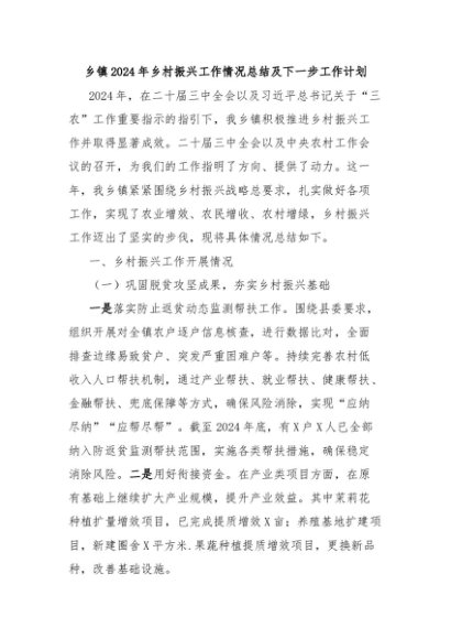 乡镇2024年乡村振兴工作情况总结及下一步工作计划