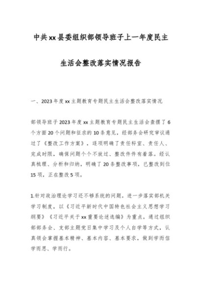 / 中共xx县委组织部领导班子上一年度民主生活会整改落实情况报告