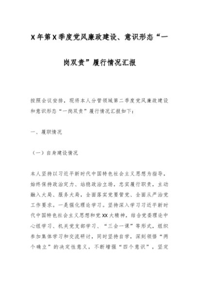 / X年第X季度党风廉政建设、意识形态“一岗双责”履行情况汇报
