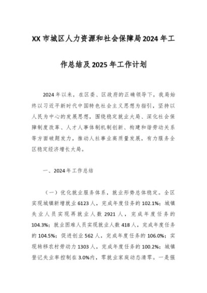 / XX市城区人力资源和社会保障局2024年工作总结及2025年工作计划
