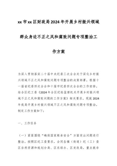 / xx市xx区财政局2024年开展乡村振兴领域群众身边不正之风和腐败问题专项整治工作方案