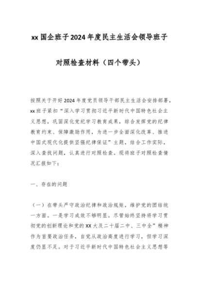 / xx国企班子2024年度民主生活会领导班子对照检查材料(四个带头)