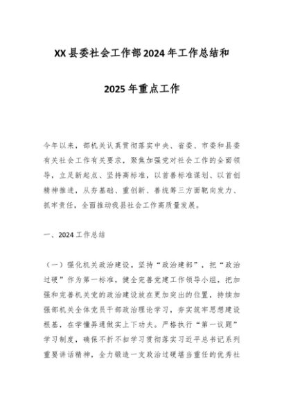 / XX县委社会工作部2024年工作总结和2025年重点工作