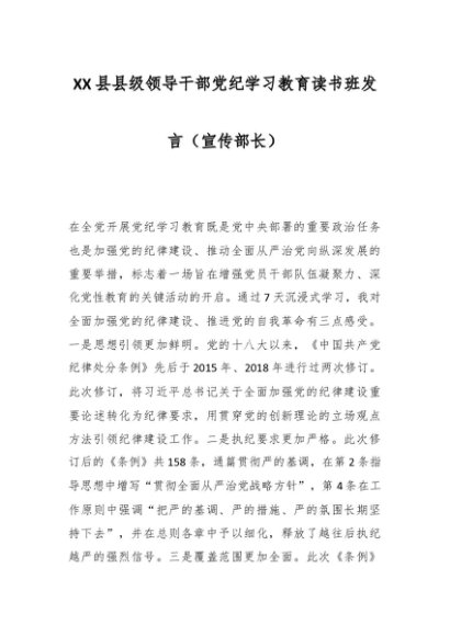 / XX县县级领导干部党纪学习教育读书班发言(宣传部长)