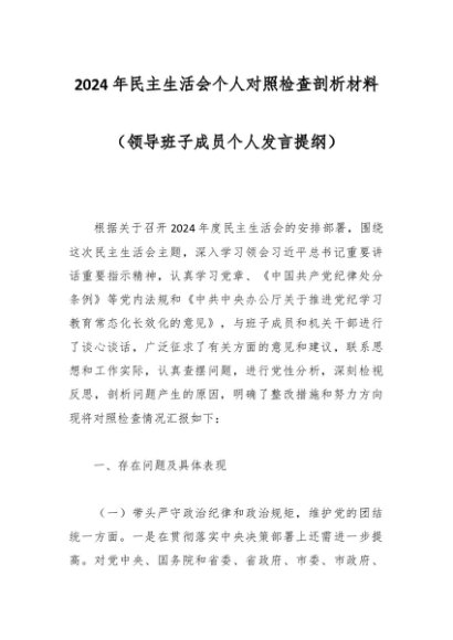 / 2024年民主生活会个人对照检查剖析材料(领导班子成员个人发言提纲)