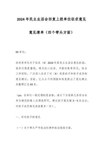 / 2024年民主生活会回复上级单位征求意见意见清单(四个带头方面)