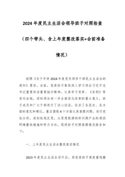 / 2024年度民主生活会领导班子对照检查(四个带头、含上年度整改落实+会前准备情况)