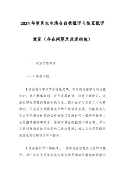 / 2024年度民主生活会自我批评与相互批评意见(存在问题及改进措施)