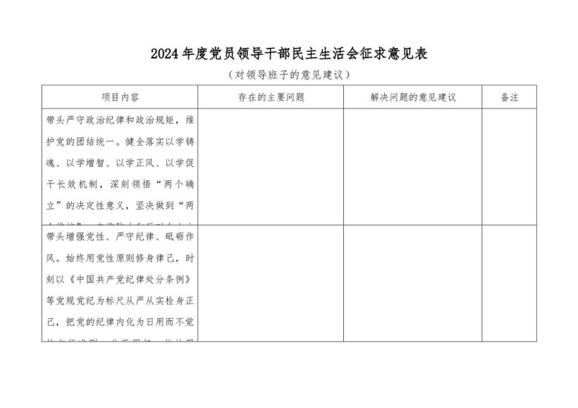 / 2024年度党员领导干部民主生活会征求意见表(按四个带头)