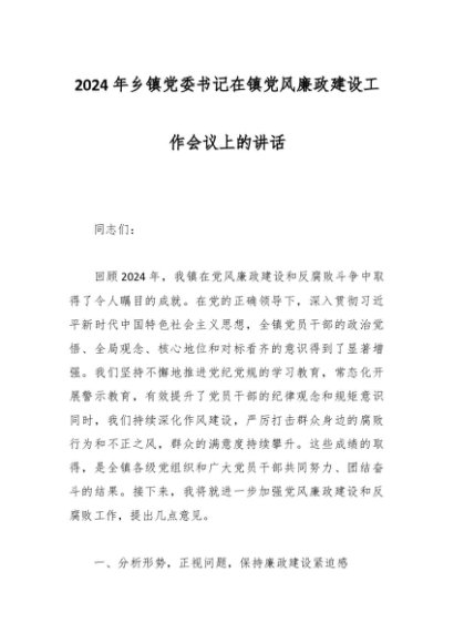 / 2024年乡镇党委书记在镇党风廉政建设工作会议上的讲话