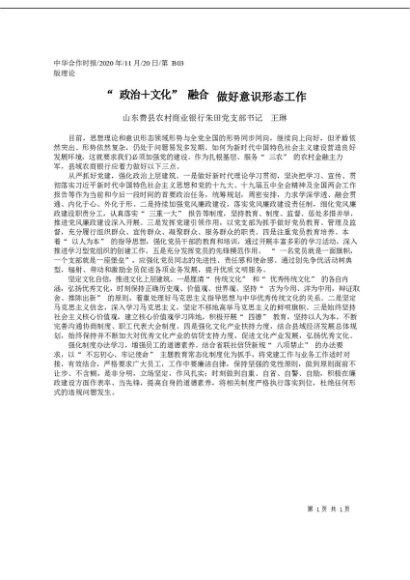 / 2020.11.20山东费县农村商业银行朱田党支部书记王琳:政治+文化融合做好意识形态工作