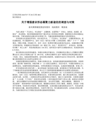 / 2020.07.30泰兴黄桥镇党委宣传委员统战委员鲍家成:关于增强意识形态凝聚力新途径的调查与对策