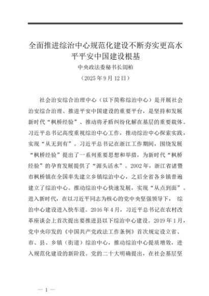 / 署名文章:20250912全面推进综治中心规范化建设不断夯实更高水平平安中国建设根基——中央政法委秘书长訚柏