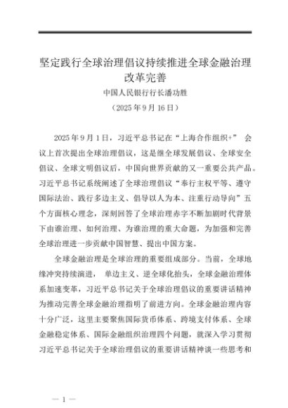 署名文章:20250916坚定践行全球治理倡议持续推进全球金融治理改革完善——中国人民银行行长潘功胜