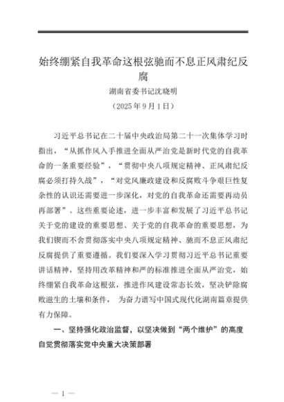 / 署名文章:20250901始终绷紧自我革命这根弦驰而不息正风肃纪反腐——湖南省委书记沈晓明