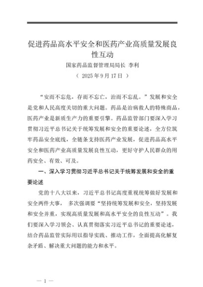 署名文章:20250917促进药品高水平安全和医药产业高质量发展良性互动——国家药品监督管理局局长 李利