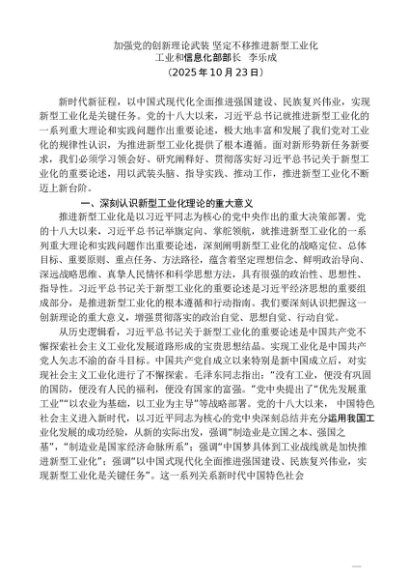 署名文章:20251023加强党的创新理论武装 坚定不移推进新型工业化——工业和信息化部部长李乐成