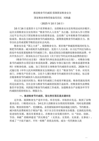 署名文章:20251016推进粮食节约减损 保障国家粮食安全——国家粮食和物资储备局局长刘焕鑫