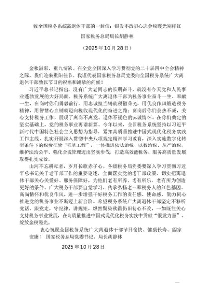 / 署名文章:20251028致全国税务系统离退休干部的一封信:银发不改初心志金税霞光别样红——国家税务总局局长胡静林