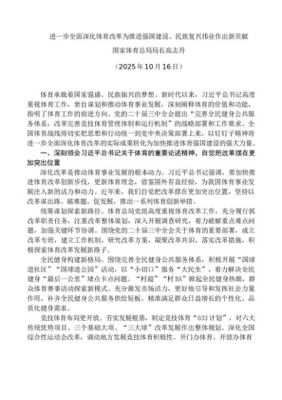 / 署名文章:20251016进一步全面深化体育改革为推进强国建设、民族复兴伟业作出新贡献——国家体育总局局长高志丹