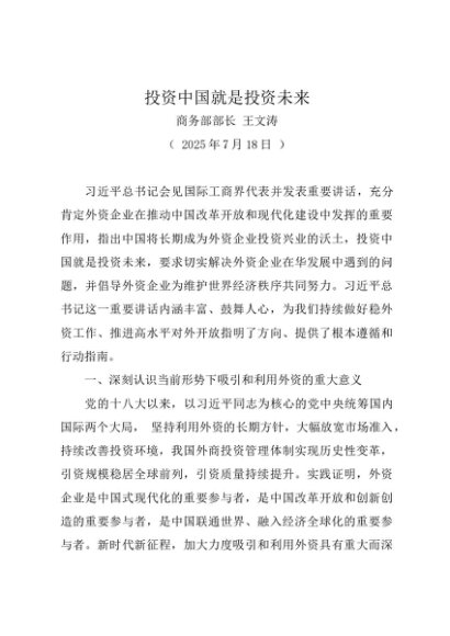 / 署名文章:20250718投资中国就是投资未来——商务部部长 王文涛