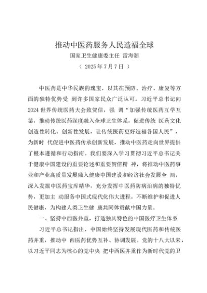署名文章:20250707推动中医药服务人民造福全球——国家卫生健康委主任 雷海潮