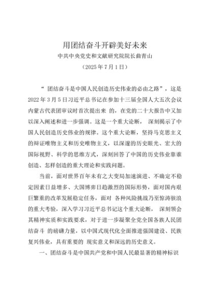 署名文章:20250701用团结奋斗开辟美好未来——中共中央党史和文献研究院院长曲青山