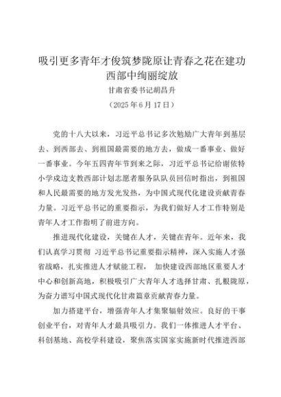 署名文章:20250617吸引更多青年才俊筑梦陇原让青春之花在建功西部中绚丽绽放——甘肃省委书记胡昌升