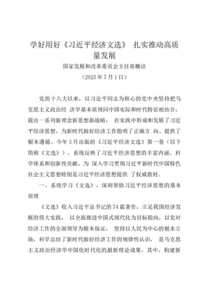 署名文章:20250701学好用好《习近平经济文选》 扎实推动高质量发展——国家发展和改革委员会主任郑栅洁