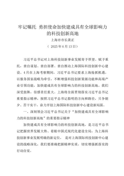 署名文章:20250613牢记嘱托 勇担使命加快建成具有全球影响力的科技创新高地——上海市市长龚正