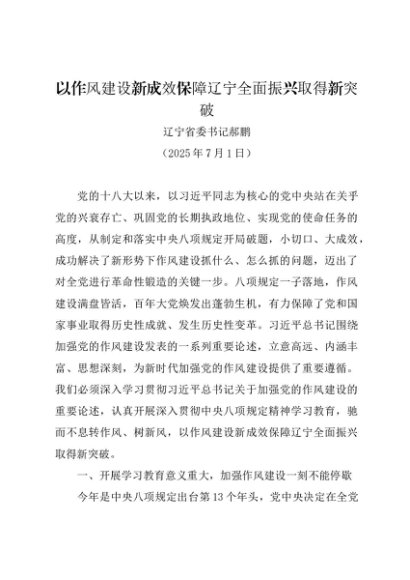 署名文章:20250701以作风建设新成效保障辽宁全面振兴取得新突破——辽宁省委书记郝鹏