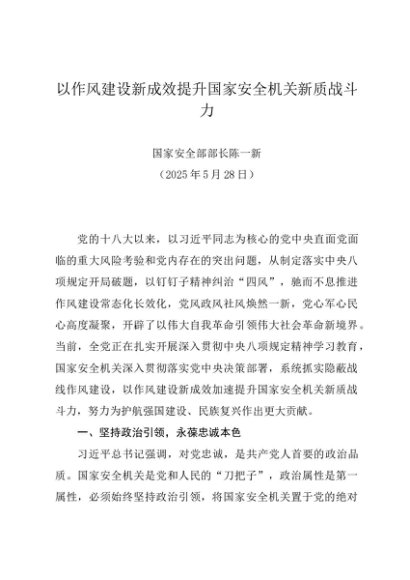 署名文章:20250528以作风建设新成效提升国家安全机关新质战斗力——国家安全部部长陈一新