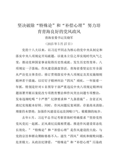 署名文章:20250527坚决破除“特殊论”和“补偿心理,努力培育青海良好的党风政风——青海省委书记吴晓军
